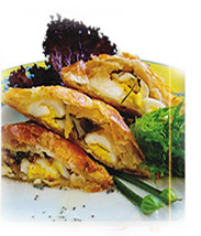 Coloque as folhas de verduras escolhidas no prato, abra ao meio e sobreponha os pedaços do folheado assado e regue com azeite. Salpique sementes de papoula para dar acabamento.