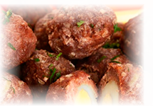 Junte o iogurte, o hortelã e o coco ralado e faça o molho. Reserve. Coloque os temperos na carne e misture bem. Deixe descansar por 20 minutos. Envolva os ovos com a carne temperada.
