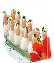 3. Enrolar as fatias de presunto de peru defumado, em forma de cone, e introduzir na abertura dos avos de codorna de forma que a parte superior fique mais aberta.